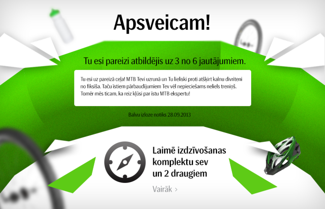 The user receives results that characterizes his knowledge about MTB, and gets an opportunity to participate in a raffle of a MTB related prize by answering the questions that are connected to the mountain bicycle competition.