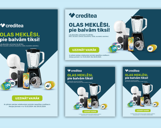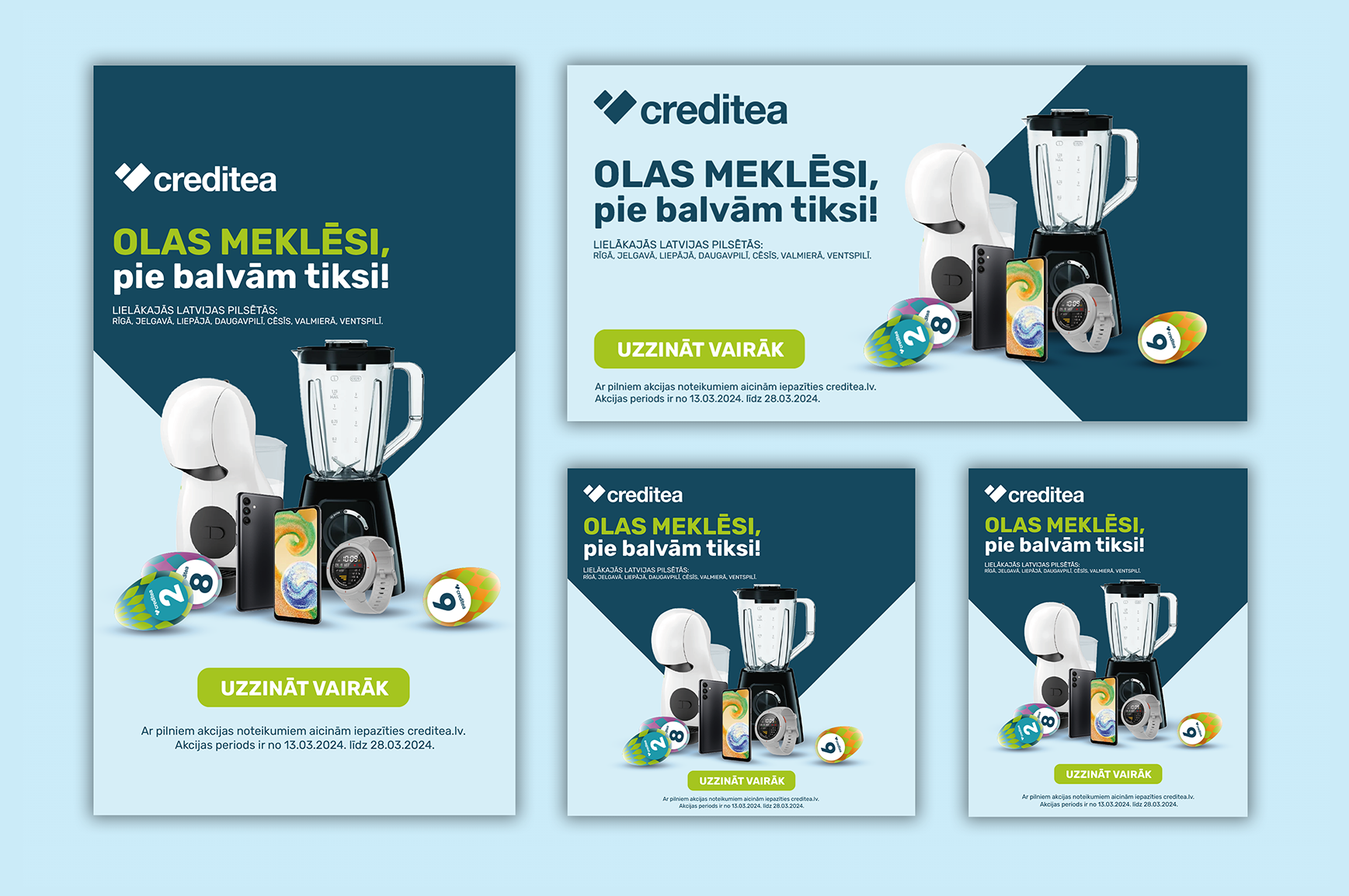 Every life is in his own hands, but the visual design is in the creative minds of the Armadillo team! Therefore, in cooperation with Creditea, we gladly developed Creditea banners for the digital environment and visual materials for social networks that appeal and attract the attention of everyone interested. In addition, we created an Easter activity, in which everyone throughout Latvia had the opportunity to look for eggs with numbers on them on the Creditea website to create codes that would allow one lucky person in each city, by entering the code at the parcel machine, to win a prize.