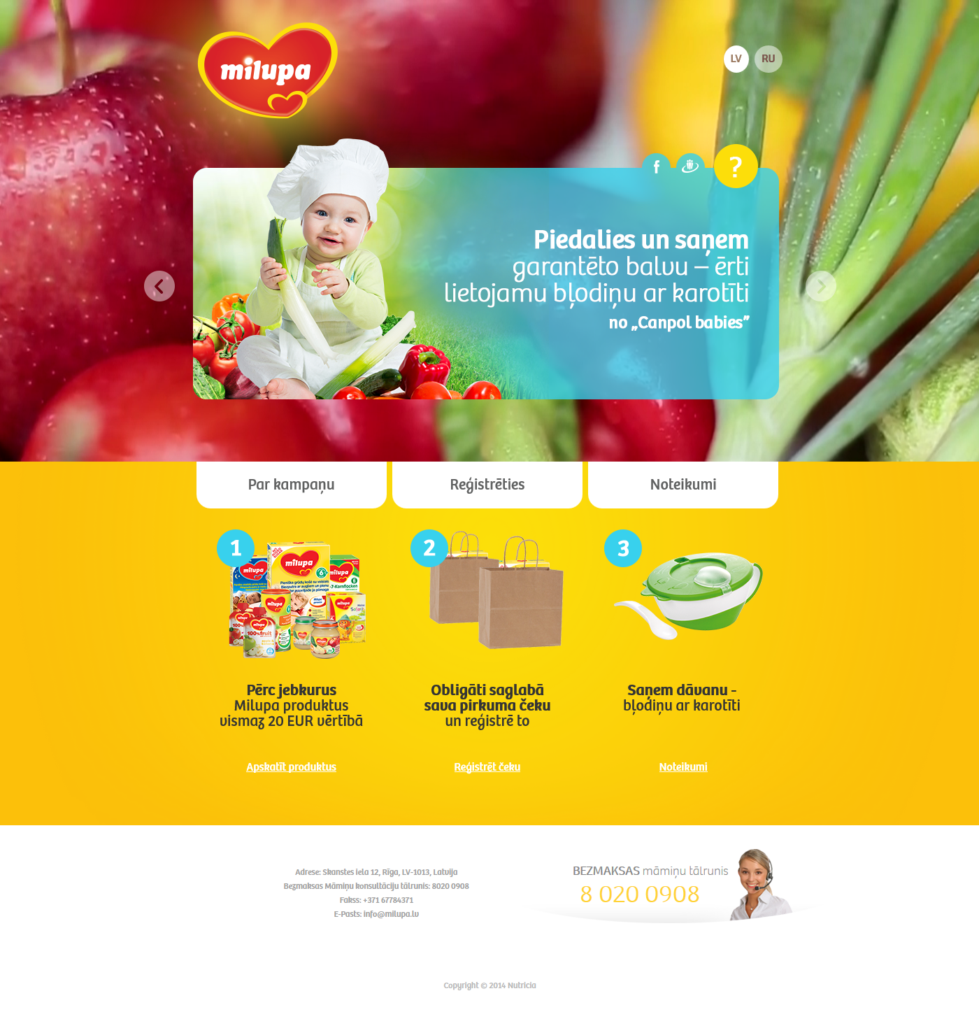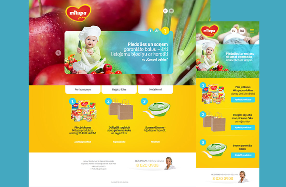 Design Atpakaļ Milupa summer campaign Joyful and bright support for baby food manufacturer Milupa summer campaign. Also we created a mobile version of the campaign’s webpage, which was laconic and easy to review, handy and available at any time and place. Atpakaļ